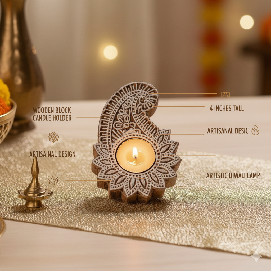 Bring the warmth and traditional artistry of India into your home with our Hand-Carved Paisley Wooden Tea Light Holders. Inspired by the intricate designs of traditional wooden block printing (the same blocks used for fabric and paper), these holders are a unique and elegant way to light up any space. Perfect for festive occasions like Diwali, or simply adding a touch of Boho-Chic charm to your everyday decor.