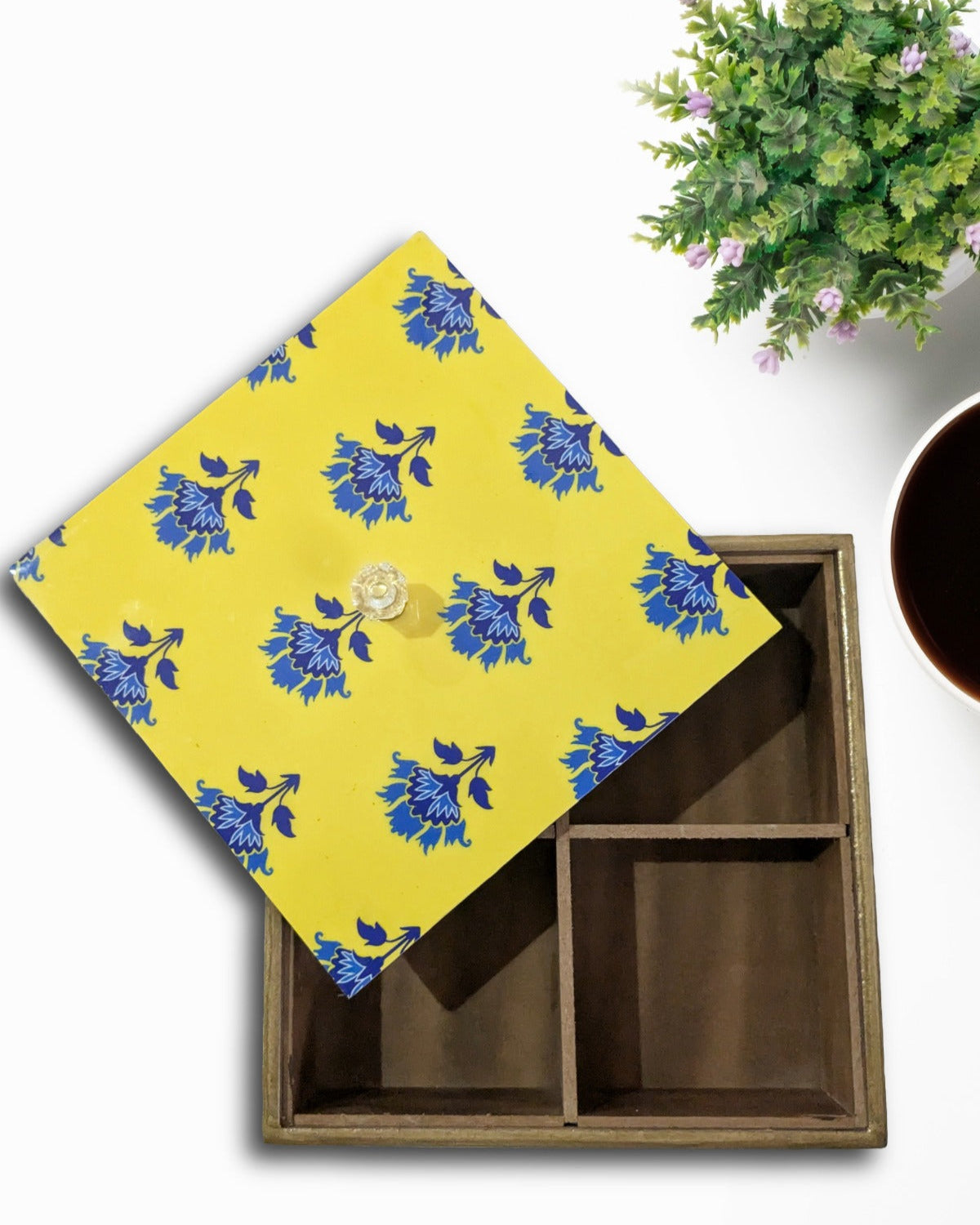Bring elegance and utility to your kitchen or living space with this handcrafted wooden storage box. Featuring a vibrant elephant print lid, Red and Green Motif print, Yellow and Blue flower print and evergreen Blue Roses FLoral Print and four spacious compartments, this multipurpose box is perfect for organizing tea bags, dry fruits, spices, or small snacks.